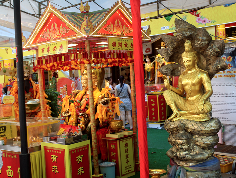 Une chose à savoir sur Waterloo Street : elle “affiche complet” tous les après-midis, c’est clair, mais les week-ends et les jours fériés, c’est pire encore. La foule y est d’une extravagante densité, se partageant entre un centre commercial (au nord), le Kwan Im Thong Hood Cho Temple et un nombre impressionnant de boutiques vendant aussi bien de l’artisanat chinois (de grande qualité, parfois aussi de la pacotille) et de très nombreux articles religieux, à des prix souvent élevés. Ce qui nous amène à penser que quand on croit, on ne compte pas plus que quand on aime !