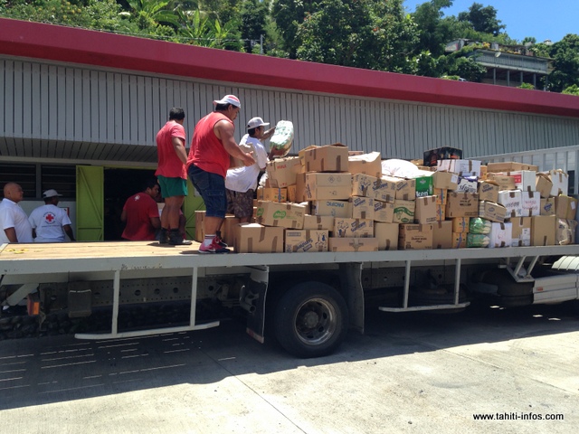HITIAA O TE RA, le 02/02/2016 - Suite aux différentes récoltes de dons organisées le 23 janvier dernier, dans les Carrefour et Champion de Tahiti, neuf tonnes de denrées alimentaires ont été récoltées. Une initiative du collectif Ordre de Malte, Secours Catholique et Croix-Rouge. Ce matin, l'ensemble des produits ont été acheminés sur Papeno'o et Tiarei, afin de venir en aide à plus de 1 400 personnes sinistrées.