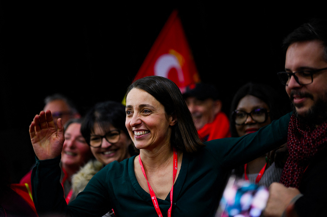 Cournon-d'Auvergne, France | AFP | vendredi 31/03/2023 - Coup de théâtre à la CGT: la responsable de la Fédération des cadres (Ugict) Sophie Binet a été élue vendredi secrétaire générale de la CGT, après Philippe Martinez, devenant ainsi la première femme à la tête du syndicat depuis sa création en 1895, avec la lourde charge de recoller les morceaux en interne, en pleine bataille sur la réforme des retraites.