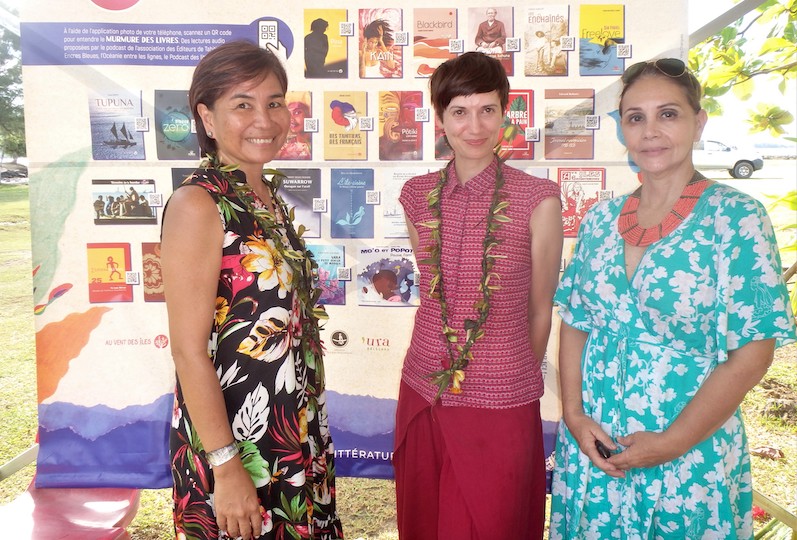 Le premier salon du livre de Bora Bora vient de se termine. Ici, Jasmina et Pascale de la DGEE entourent la romancière Flore Vesco.