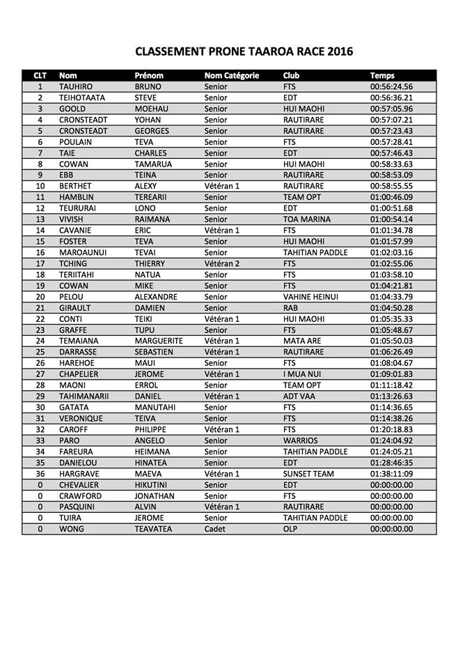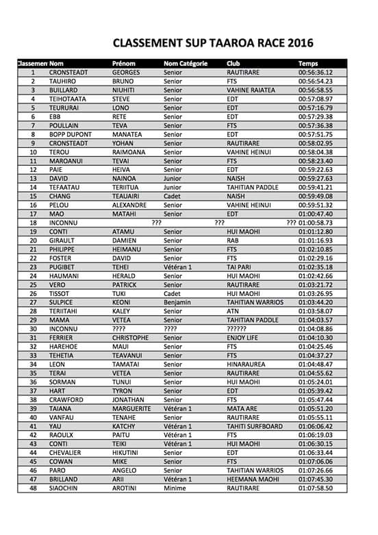 En 4e, 5e et 6e place on retrouve les trois rameurs d’Edt Va’a, Steeve Teihotaata alias ‘l’extraterrestre’, Lono Teururai et Rete Ebb. Teva Poulain, lui aussi une star du Waterman Tour, obtient la 7e place. Le Sup Race est une discipline en pleine expansion et possède son championnat propre, cette course en faisant partie.