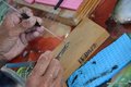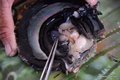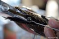 La deuxième étape est le choix d'une huître réceptrice qui est en bon santé et qui a une gonade large et bien développée, ou glande reproductrice. L'huître réceptrice est ouverte avec des pinces.