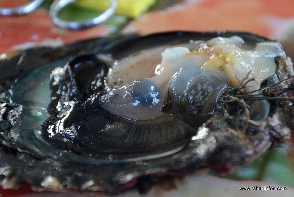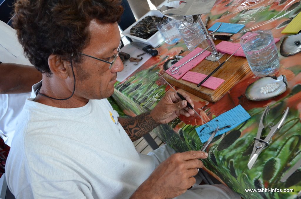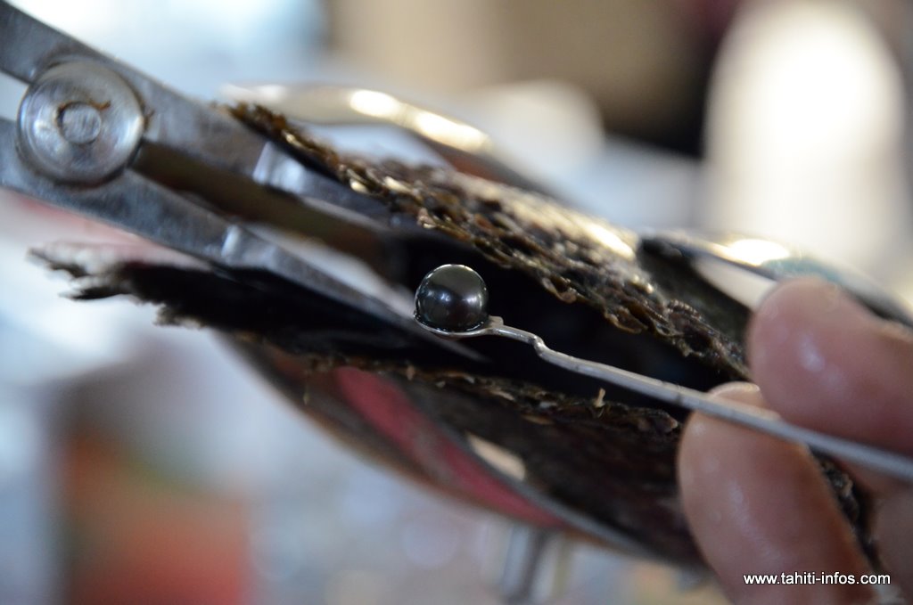 L'huître est fixée sur un support de greffe. Des instruments chirurgicaux ont été particulièrement conçus et sont utilisés pour faire l’incision dans le tissu de l’huître réceptrice. Le nucléus est alors inséré. Ce nucléus est de 6-9mm de diamètre et provient des mollusques bivalves d'eau doux du Tennessee, plus particulièrement du fleuve du Mississippi des Etats-Unis.(source : Perles de Tahiti.net )