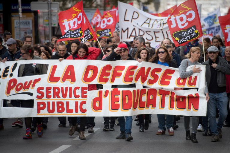 Paris, France | AFP | lundi 11/11/2018 - Des personnels des écoles, collèges et lycées étaient en grève lundi, à l'appel de tous les syndicats de l'Éducation nationale pour dénoncer les suppressions de postes, une première depuis 2011.