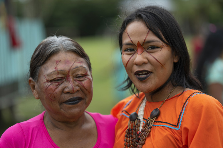 Pour l'occasion, les anciens ont ressorti leurs tuniques et ornements de plumes colorées, colliers de perles, de graines et autres dents de jaguar. A l'aide de plantes tinctoriales, hommes et femmes se peignent le visage de motifs zoomorphes, inspirés des animaux de la jungle, serpent, panthère ou araignée.