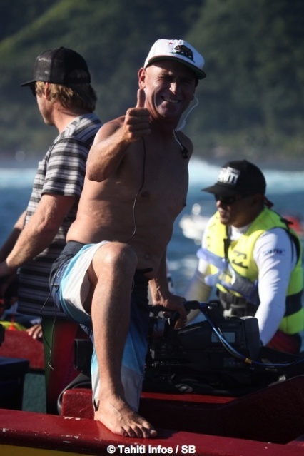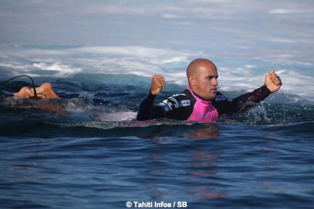Kelly Slater ravit le public avec d’excellentes notes. Sûr de son score rapidement acquis (18.97 sur 20), il lève les bras devant un des caméramans bien avant la fin de la série.