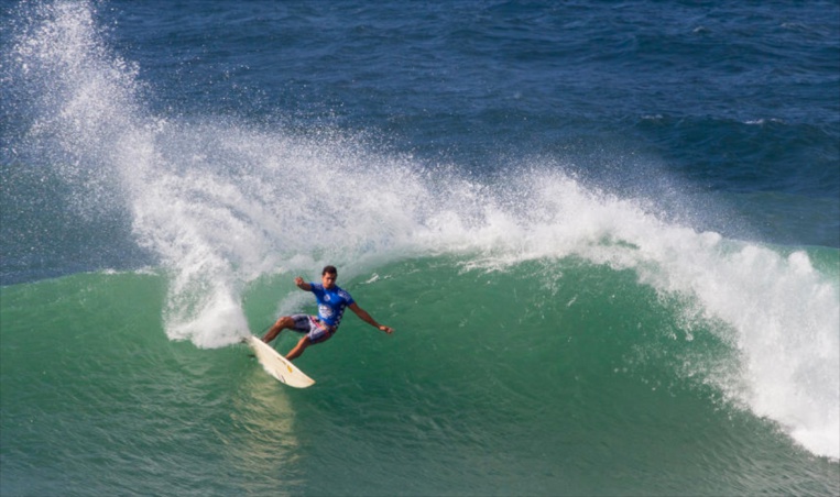« La première série s’est faite contre deux Hawaiiens, Kahea Hart et TJ Barron, je les regardais surfer quand j’étais plus petit. Kahea est plus âgé mais TJ a 28 ans. J’ai eu la chance d’avoir de bonnes vagues mais eux aussi ont eu des vagues. Tu vois juste un mur devant toi, tu ne peux pas savoir ce que la vague va donner, 2 ou 3 manœuvres…C’est dur, certains font une bonne manouvre radicale et ramassent les points…Si tu frappe la vague sur la lèvre, vu qu’elle est grosse, tu peux obtenir beaucoup de points, avec les tubes également. »