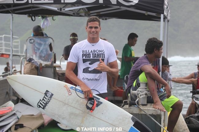 « Je suis grand et lourd donc je glisse bien, je vais vite. C’est cool de faire de gros ‘carves’, de gros ‘floaters’ ou de gros tubes. Je n’ai pas eu de stratégie, j’ai surfé comme d’habitude en essayant de me faire plaisir. De la chance et du travail, je suis content aujourd’hui de passer des séries dans des compets’ pros contre des gars qui sont très forts. » SB