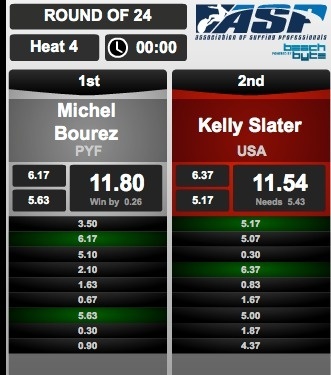 Michel Bourez remporte donc sa série en totalisant 11.80 sur ses deux meilleures vagues, contre 11.54 pour Kelly Slater. Il accède ainsi aux 8èmes de finale et devra se confronter à Adrian Buchan l’australien.