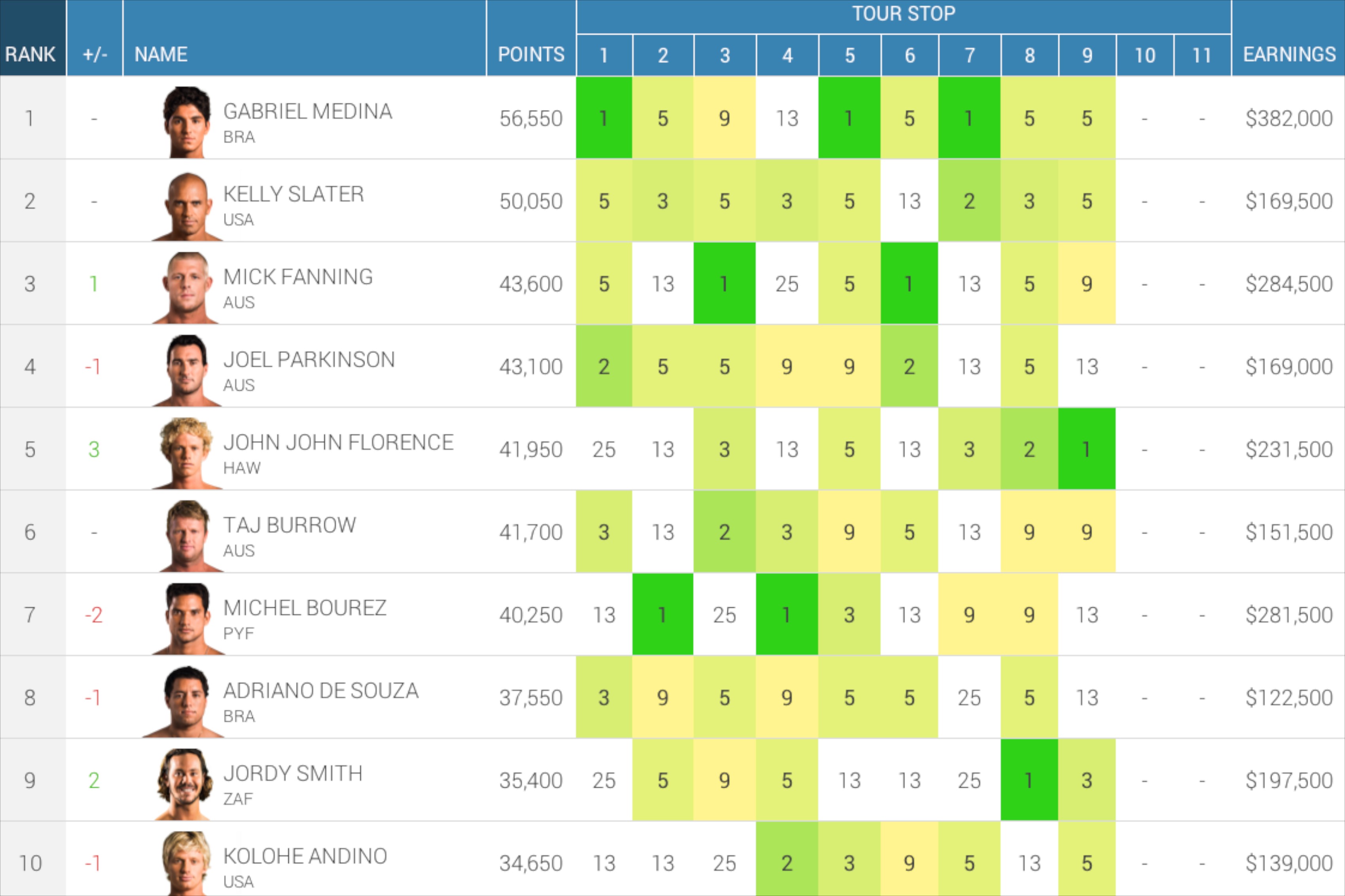 Les deux leaders ne seront pas allés plus loin que les quarts de finale. Gabriel Medina est leader avec 56 550 points, Kelly Slater est 2ème avec 50 050 pts puis Mick Fanning, Joel Parkinson, John John Florence, Taj Burrow et Michel Bourez sont dans une fourchette comprise entre 43 600 pts pour Mick et 40 250 pts pour Michel.
