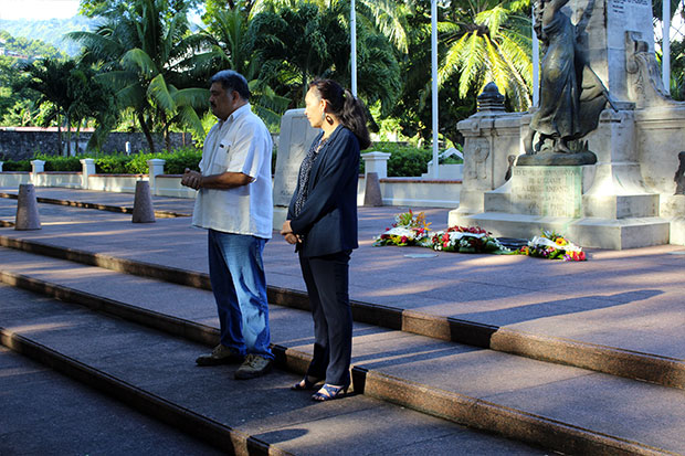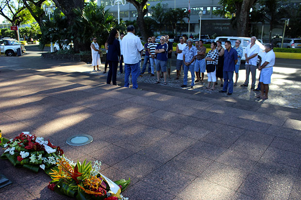 Vendredi dernier, Heifara Parker, secrétaire général d' A Tia i Mua, et la ministre du Travail,Téa Frogier, ont déposé des gerbes de fleurs au pied du monument aux morts afin de commémorer les travailleurs décédés ou blessés dans l'exercice de leurs fonctions.