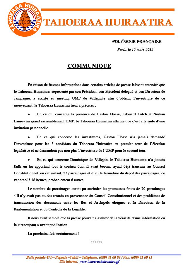 En raison de fausses informations dans certains articles de presse laissant entendre que le Tahoeraa Huiraatira, représenté par son Président, son Président délégué et son Directeur de campagne, a assisté au meeting UMP de Villepinte afin d’obtenir l’investiture de ce mouvement, le Tahoeraa Huiraatira tient à préciser :