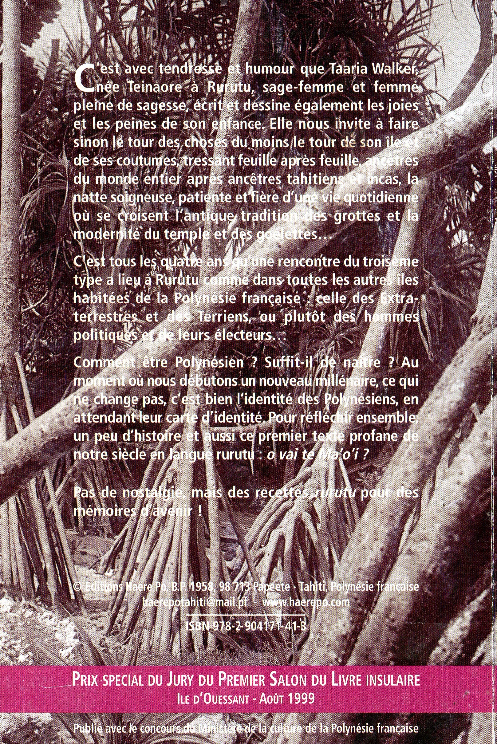 En août 1999, le 1er salon du livre insulaire de Ouessant créé un prix spécial pour un petit livre qui regorge d’histoires inconnues au monde, celui de Taaria Walker : « Rurutu, Mémoires d’avenir d’une île australe » est un livre précieux du patrimoine polynésien, écrit par une femme Rurutu, porteuse de savoir, qui aura 85 ans en octobre 2015.
