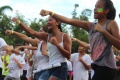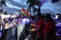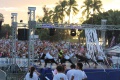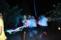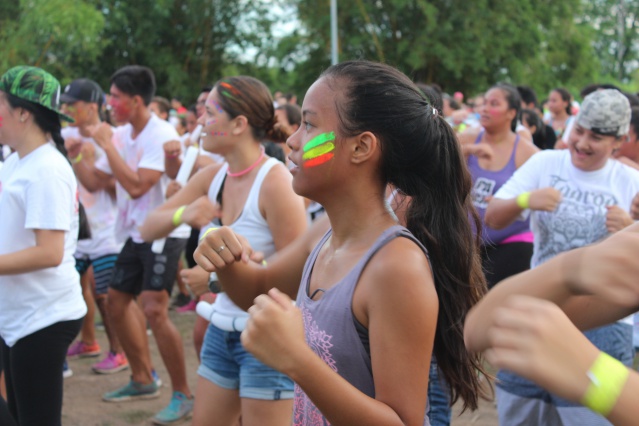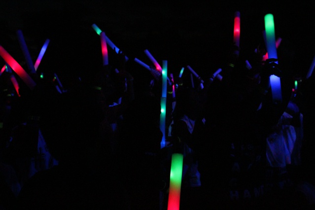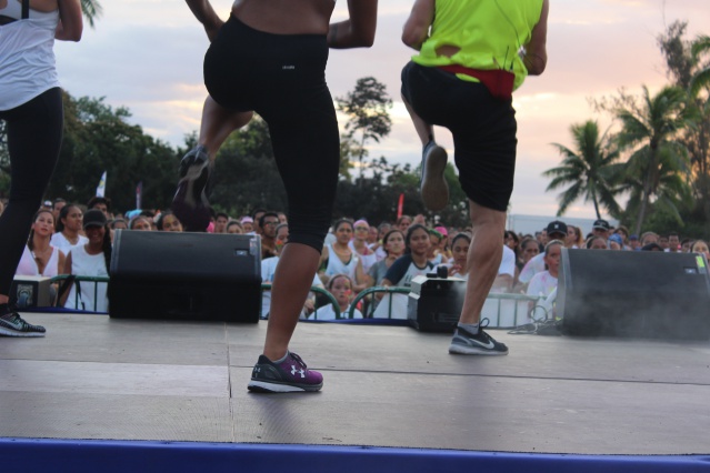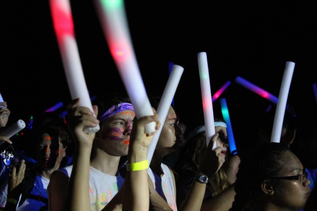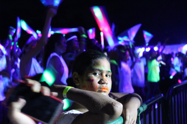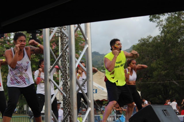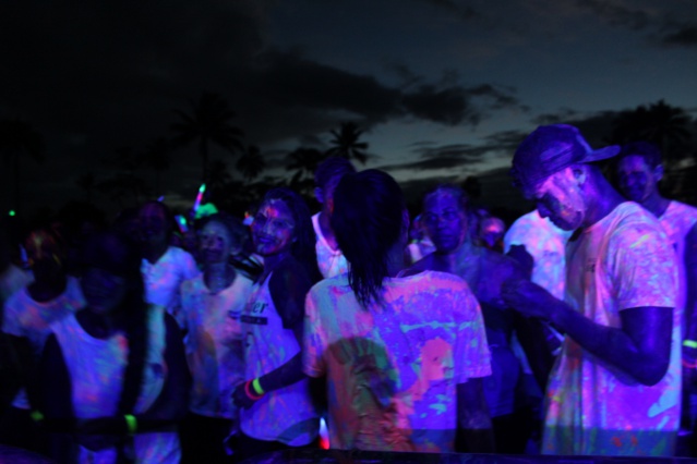 C’est au coucher du soleil que les équipes de la Tahiti Glow Party ont commencé à arroser les sportifs de peinture phosphorescente. Vers 18h00 la foule hilare « jumpait » au ryhtme de la coach qui donnait tout ce qu’elle avait depuis la scène. A la nuit tombée, les lumières bleues ont fait ressortir les peintures phosphorescentes, donnant une nouvelle ambiance au parc.