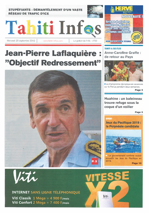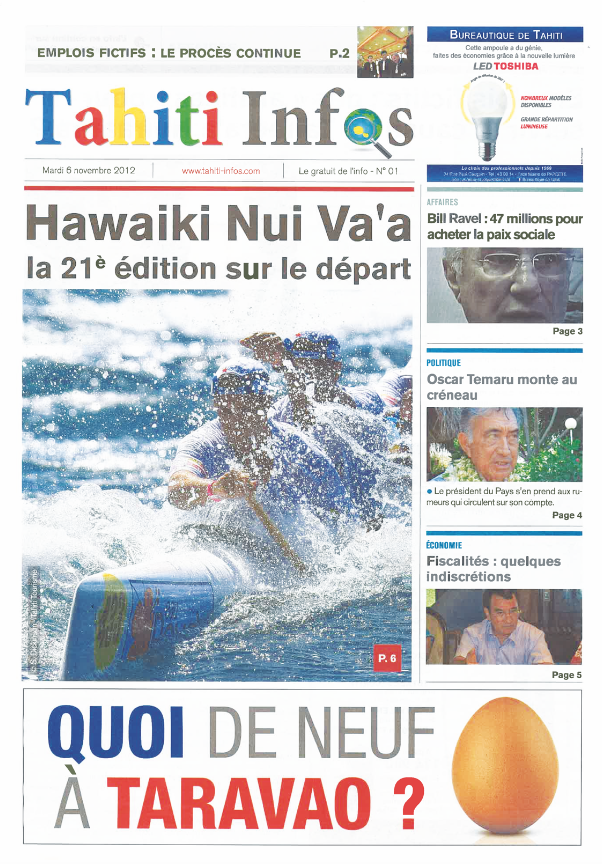 Si le site d’information poursuit son activité, c’est fin 2012 que la startup renonce à son statut de pure player. Après avoir conquis sa place sur internet, l’idée est en effet en germe depuis plusieurs mois de transformer l’essai avec une édition papier. Ce journal sera gratuit et comptera 16 pages imprimées sur papier glacé les mardis, jeudis et samedis. Le premier numéro du journal Tahiti Infos est publié le mardi 6 novembre 2012. Il consacre sa Une à la 21e édition de la course Hawaiki Nui Va’a.