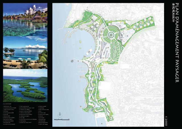 Ce qui n’était alors qu’un souhait – réaliser le "premier vrai complexe touristique de Polynésie française" – a pris la forme d’un ensemble de 326 500 m2 de surface-plancher, sous la plume du bureau d’étude chinois, le tout annoncé aux normes HQE (Haute Qualité Environnementale) : cinq hôtels de 5 à 6 étoiles dont un condo-hôtel, un hôtel-casino et un complexe d'une cinquantaine de bungalows sur pilotis en zone récifale ; 2102 unités d’hébergement, principalement des suites de 150 à 180 mètres carrés commercialisées de 1500 à 3000 USD la nuitée.