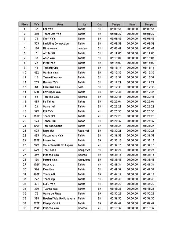 Dans la dernière portion, le tenant du titre Shell Va’a va se faire dépasser par Team Opt. Les 4 premiers, Edt Va’a, Team Opt, Shell Va’a et Paddling Connection, sont arrivés dans une fourchette de 2 minutes, le suspense reste donc entier pour la 2e étape qui aura lieu vendredi matin entre Vairao et Tautira.