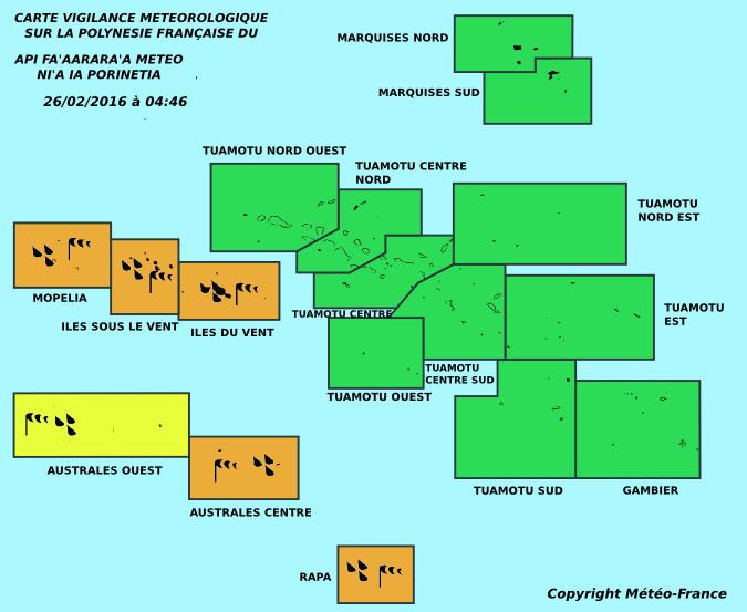 PAPEETE, le 26 février 2016. L'archipel de la Société est toujours en vigilance orange pour fortes pluies et en vigilance jaune pour vent violent. De forts cumuls de pluies sont encore possibles, notamment sur les côtes Nord et Ouest de Tahiti et de Moorea.