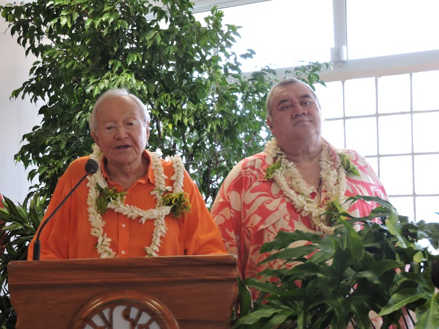 PAPEETE, le 16 février 2018. Les présidents du Here ai'a et du Tahoera'a Huira'atira ont signé vendredi un accord de partenariat. Gaston Flosse a accordé au moins "une place en position éligible" pour Roméo Tauraa.