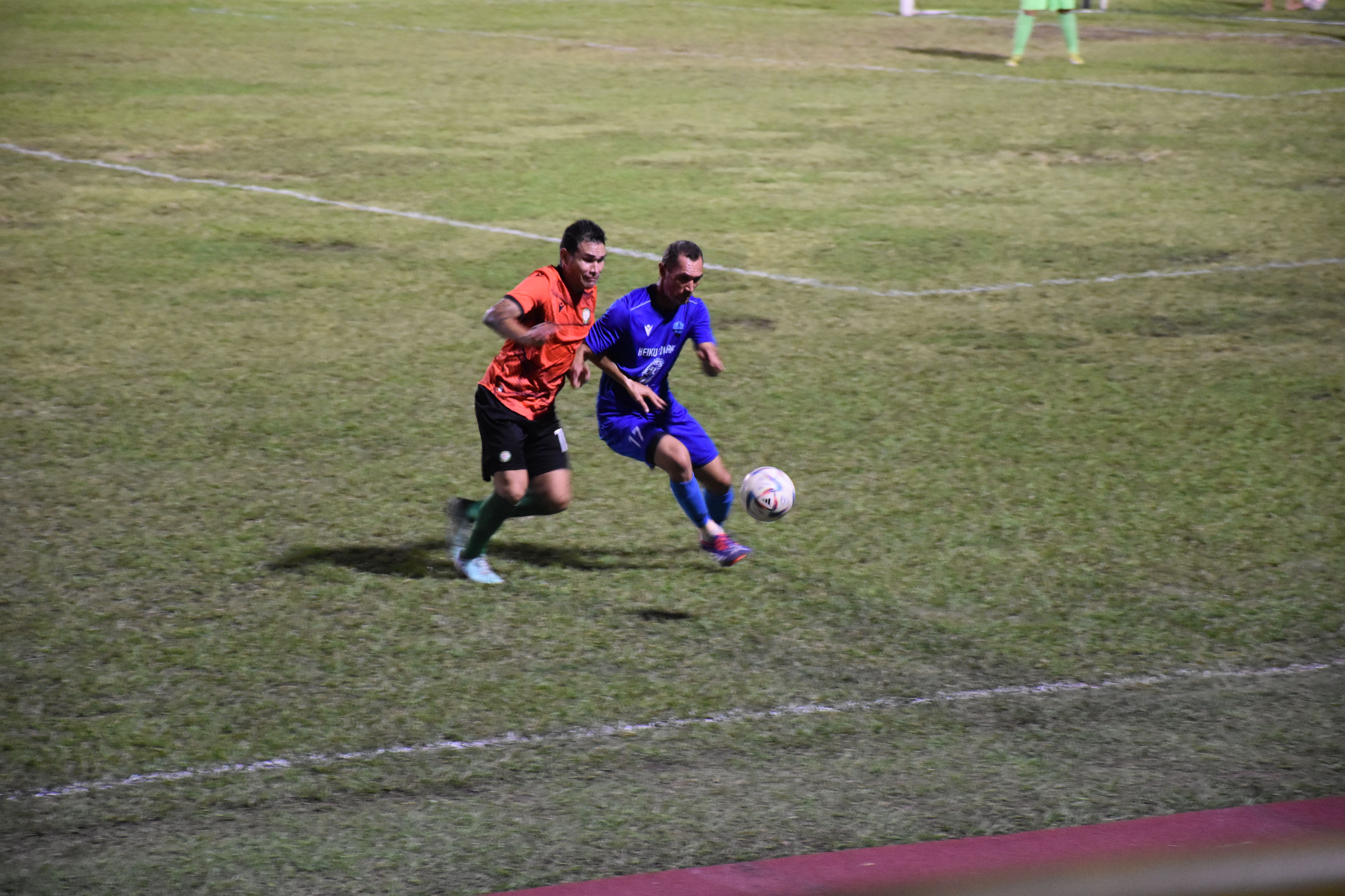 Dans la foulée, les orange passent tout près de l’égalisation. Moeterauri Rohi se retrouve seul face au gardien, mais ce dernier s’interpose parfaitement. Quelques minutes plus tard, l’attaquant local semble bousculé dans la surface après une ouverture lumineuse de Garry Rochette, mais l’arbitre ne bronche pas, au grand dam du public. La rencontre s’anime de part et d’autre. Pueu, portée par un excellent Franck Papaura, frôle le break à la demi-heure. Le milieu slalome dans la défense orange et sert à nouveau Jason Papaura, dont la frappe est arrêtée par le gardien. Tamarii Punaruu réplique par une frappe puissante des 35 mètres signée Rochette, frôlant le cadre. La mi-temps approche. Les duels s’intensifient. Le match s’emballe. Malgré plusieurs situations chaudes dans la surface adverse, les hommes de Raimana Bu Luc n’arrivent pas à recoller avant la pause. Les bleus rentrent aux vestiaires avec cet avantage précieux, 1 à 0.
