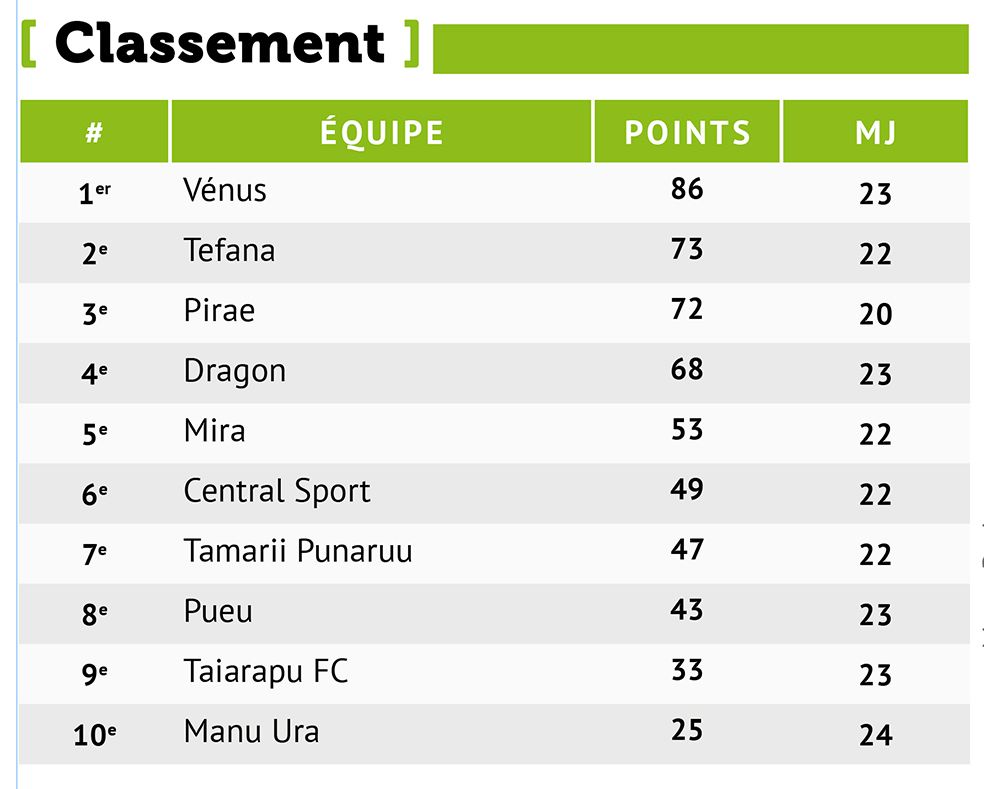 Dans cette journée, Pirae continue de mettre la pression sur Vénus en tête du classement. Les joueurs de Mahina restent solides et l’ont emporté face à Taiarapu 5-0. Le titre est plus que jamais indécis et la fin de saison sera intense. Dragon et Central, quant à eux, se sont quittés dos à dos 2-2. Le dernier match opposait Tefana à Mira. Les jaune et vert de faa’a ont remporté le match 7-4.