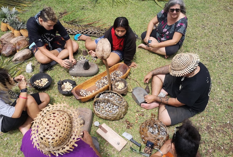 C’est à l’hôtel Atiapiti, juste à côté du marae Taputapuātea, que l’association A Nui Taputapuātea a décidé de marquer Matari’i i ni’a avec une journée culturelle. En matinée, plusieurs ateliers étaient prévus pour "retrouver les gestes oubliés", explique Titaua Raapoto, présidente de l’association. Ainsi, les adhérents ont pu entre autres apprendre le tressage des pāua (assises en feuilles de cocotier) pour la cérémonie du soir, le décorticage de coco, râpage et recueil du lait avec le mo’u (les fibres du papyrus). Suite à la formation auprès de Hinatea Colombani, l’association a aussi proposé le cassage de noix de bancoule pour la fabrication des tūrama (bougies) pour éclairer la réception du soir.