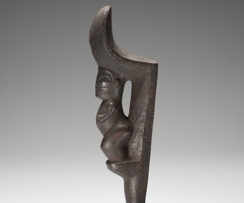 Cet étrier d’échasse, probablement originaire des îles Marquises, a été sculpté dans du bois de fer, un bois solide appelé 'aito en tahitien ou toa aux Marquises.