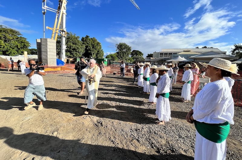 C'est une cérémonie relativement intimiste qui s'est déroulée jeudi matin derrière le parc expo de Mamao, sur le chantier du futur centre d'accueil des "personnes à la rue" –le Père Christophe n'aime pas le terme de SDF– Te Vai-ete 'api. Un centre qui doit sortir de terre mi-2023 pour remplacer l'ancien Te Vai-ete de Vaininiore, qui a fermé ses portes depuis le premier confinement début 2020. La cérémonie dirigée par le Père Cottenceau et le Père Christophe a consisté pour l'heure à la pose symbolique de la première pierre d'un chantier qui a déjà beaucoup fait parler de lui depuis le lancement du projet en 2019. À l'époque, le Père Christophe, vicaire-coopérateur de la cathédrale de Papeete et gestionnaire du centre, avait mis les autorités face à leurs responsabilités en les alertant sur l'urgence d'une réflexion sur l'avenir de son centre d'accueil de jour des sans-abris. Un centre non-conforme aux normes de sécurité et sanitaires, exigu et aux missions dispersées entre le presbytère et Vaininiore.