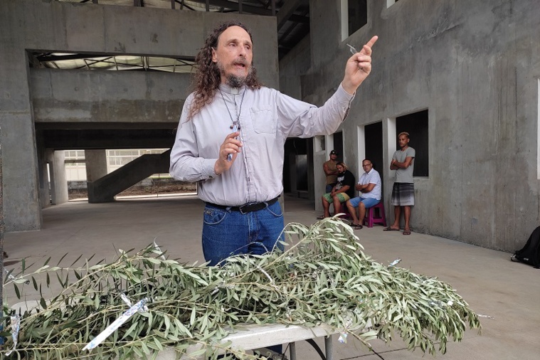 Tahiti, le 23 décembre 2022 – À l'occasion du 28e anniversaire du centre d'accueil pour les personnes sans-abri, Te Vai-ete, le père Christophe, les bénévoles et les donateurs se sont retrouvés, vendredi matin, sur le chantier du futur centre, à Mama'o, pour hisser un olivier sur la charpente afin de marquer la fin du gros œuvre.