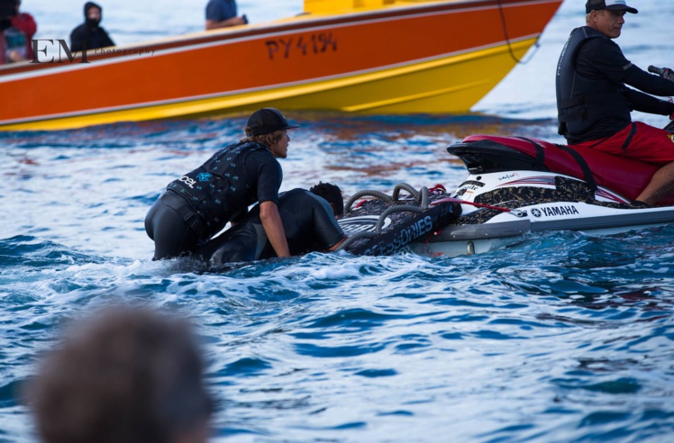 Il y a eu également les ‘wipe out’ de la journée avec la chute au mauvais endroit d’un autre spécialiste, Raimana Van Bastolaer, qui fort heureusement s’en sort choqué mais indemne. La vague était très 'ouest' et de nombreux surfeurs ont eu du mal à sortir. La palme du ‘wipe out’ le plus impressionnant revient à Niccolo Porcella. Il chute et part avec la lèvre d’une vague énorme, le Hawaiien s’en sort lui aussi miraculeusement.