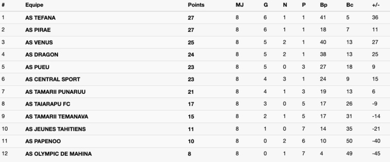 Dans les autres rencontres de cette 8e journée, Central a signé un quatrième succès de suite en championnat. Le club de la capitale a dominé Punaruu sur le score de 3-0. Les Centraliens, sixièmes, ne sont qu'à deux points seulement du podium. Pueu, de son côté, s'est imposé face au promu Papenoo (3-1) et le Taiarapu FC a disposé de Temanava (5-3).