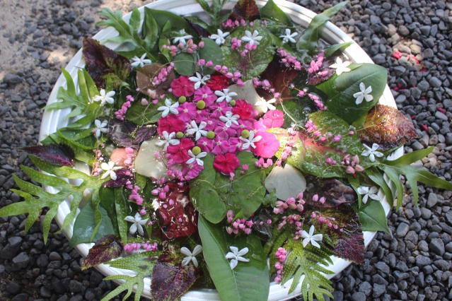 Pour cette 19e édition, les visiteurs ont été accueillis à l’entrée par les créations de Sylvie Couraud. Des "folichromies" comme elle les appelle. Dans des vasques pleines d’eau des compositions éphémères tranchaient avec le blanc du sable, les gris des pierres et l’ocre des racines aériennes et tombantes.