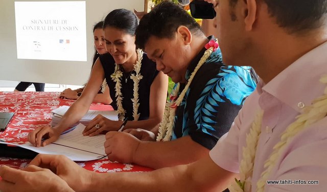 Mais tous ces projets ne pourront pas voir le jour si la commune n'est pas officiellement propriétaire. Aujourd'hui, c'est fait. La signature du contrat de cession a eu lieu mardi matin, entre le tāvana, Damas Teuira et l'administrateur de l'État, Raymond Yeddou.