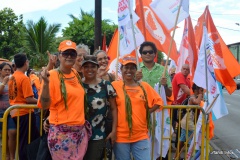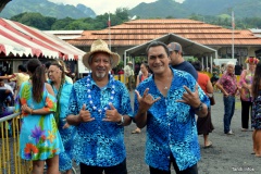 A l'unisson : "Tous pour un, trois couleurs ! (Rires, puis pointant chacun son tour) Tahoera'a tau, Tapura tana, et Tavini. Mais celui avec le drapeau Tahoera'a va voter Tavini, Tavini va voter Tapura, et Tapura va voter Tahoera'a ! (rires)"