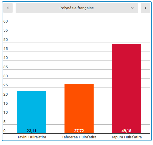 PAPEETE, le 6 mai 2018. Avec 43.04 % des voix, le Tapura Huira'atira est arrivé en tête du premier tour, devant le Tahoera'a Huira'atira (29.41%) et le Tavini Huira'atira (20,71%).
