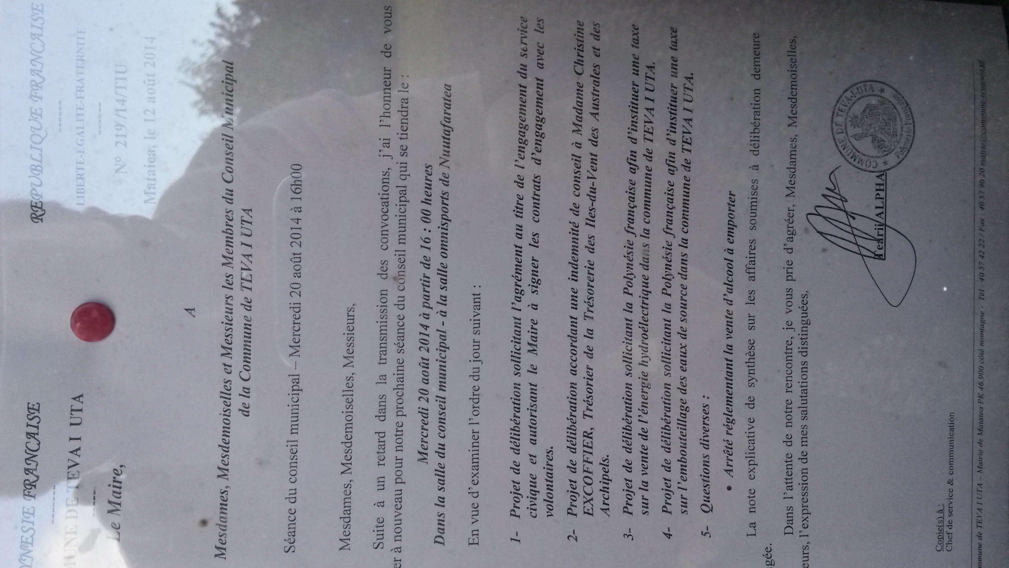 PAPEETE, le 21 aout 2014 - b[Le conseil municipal de la commune de Teva i Uta a voté ce mercredi 20 aout « une délibération sollicitant la Polynésie française afin d’instaurer une taxe sur la vente de l’énergie hydroélectrique dans la commune de Teva i Uta » et une autre sur « l’embouteillage des eaux de source ».]b