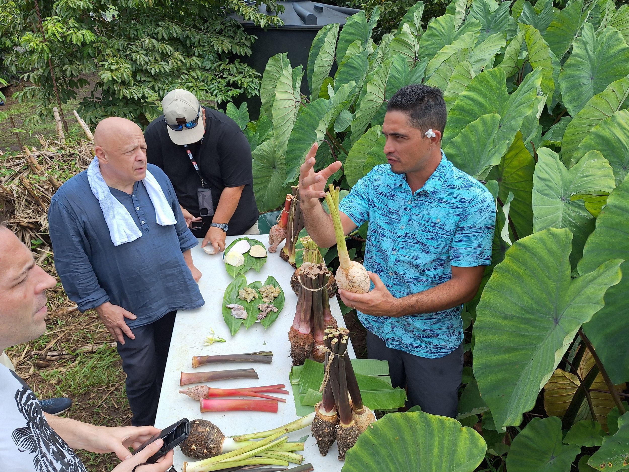 “Je me sens honoré de pouvoir partager mon petit métier de tous les jours avec un grand chef. Il nous apporte une vision supplémentaire pour valoriser nos produits : c’est très intéressant ! Je suis content qu’il se soit intéressé à la culture du taro, produit qui n’est pas assez mis en valeur, je trouve. Je cultive cinq variétés : certaines sont plus productives que d’autres, mais je prends aussi en compte le goût, les textures et les couleurs. C’est ce que j’essaie de transmettre à mon niveau.”