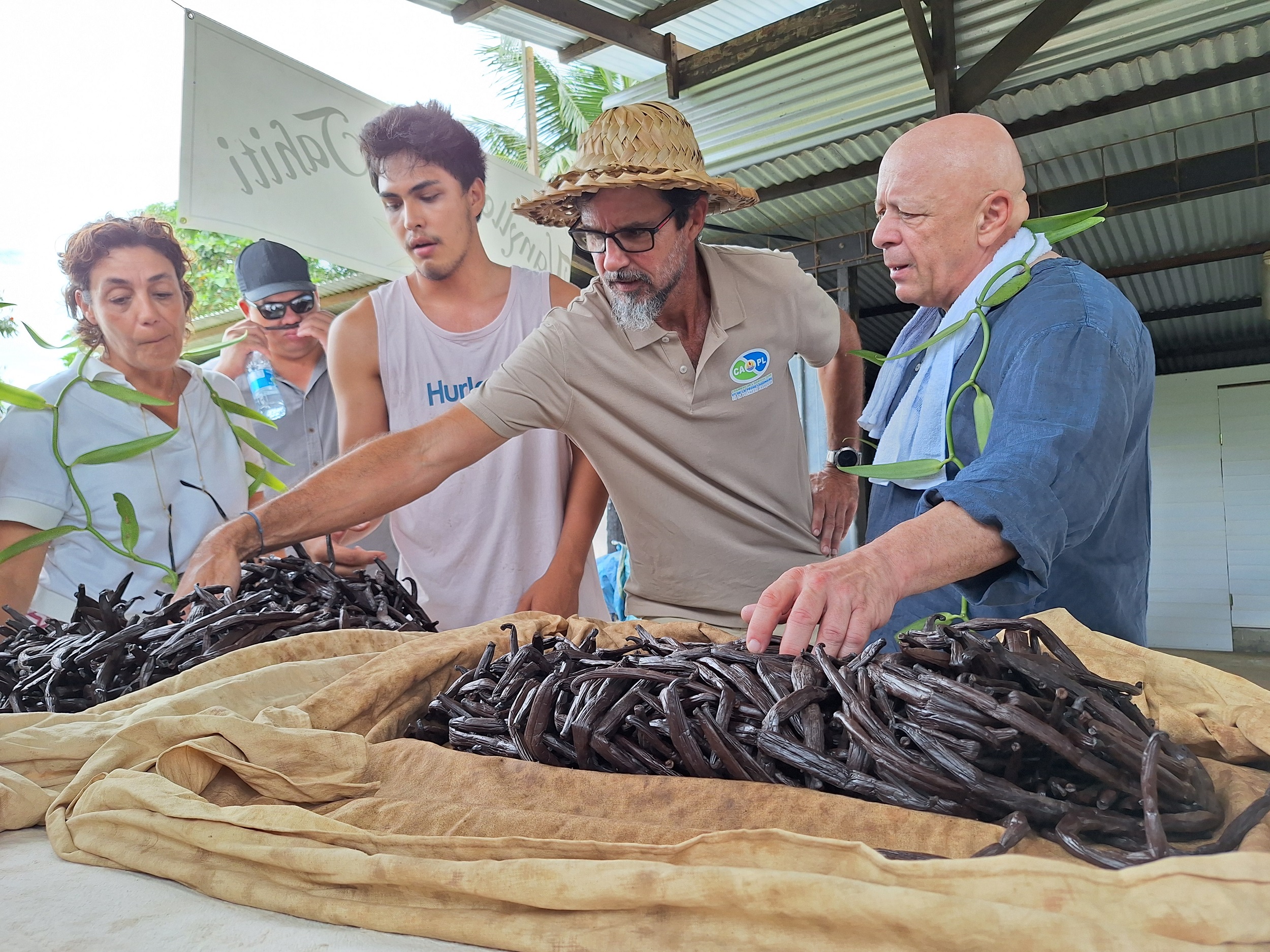 Première étape, à Mataiea, sur la plantation de taro de deux hectares de Tuhani Pugibet. Le jeune agriculteur bio a livré un aperçu de son métier, tant d’un point de vue technique que culturel. Après les champs, changement de décor à Taravao, dans une des serres de Vanylle de Polynésie, société médaillée d’or au concours général agricole 2024. Cette partie de la visite a été l’occasion pour le chef de s’initier à la vanilliculture, du mariage des fleurs jusqu’au séchage des gousses. Sans surprise, malgré un programme minuté, la délégation a été happée par le savoir-faire des producteurs.
