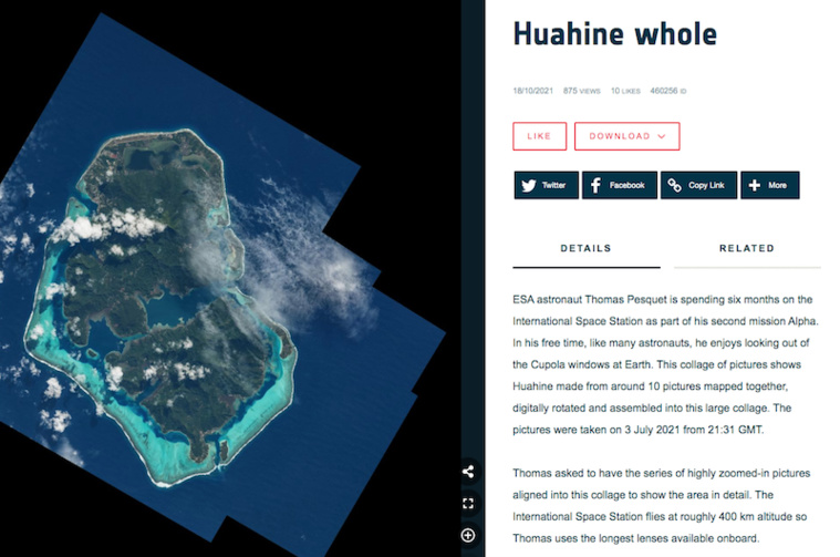Tahiti, le 18 octobre 2021 – L'agence spatiale européenne a publié lundi les "assemblages" de photographies de Huahine, Raiatea et Taha'a par l'astronaute Thomas Pesquet…