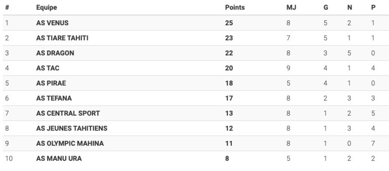 Central continue sa « descente aux enfers » en s’inclinant 3-2 face à Manu Ura, vendredi soir. Pirae a infligé une lourde défaite 7-0 à l’AS JT alors que l’avant-dernier du classement, l’Olympique de Mahina, a créé la surprise en battant Tefana 4-3, Tefana qui avait obtenu un nul contre le leader Vénus et une victoire sur Tiare Tahiti en quinze jours. SB
