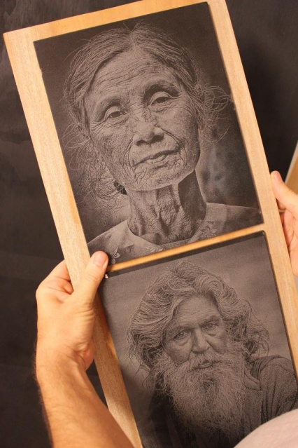 Mike, portraitiste autodidacte, s’est intéressé à la gravure sur bois il y a deux ans environ. Avant, il faisait des portraits sur demande. Maintenant, il passe des photos et du texte sur des supports variés.