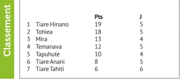 Moorea, le 25 avril 2022 - A l’issue de la 7e journée de championnat de Moorea, Tohiea a profité de sa large victoire sur la lanterne rouge Tiare Tahiti pour revenir à un point du leader Tiare Hinano. Le club de Pihaena n’a pour sa part pas joué sa rencontre face à Temanava en raison du décès de l’un de ses fondateurs. Et la rencontre entre Tapuhute et Mira a été interrompue en raison du mauvais temps.