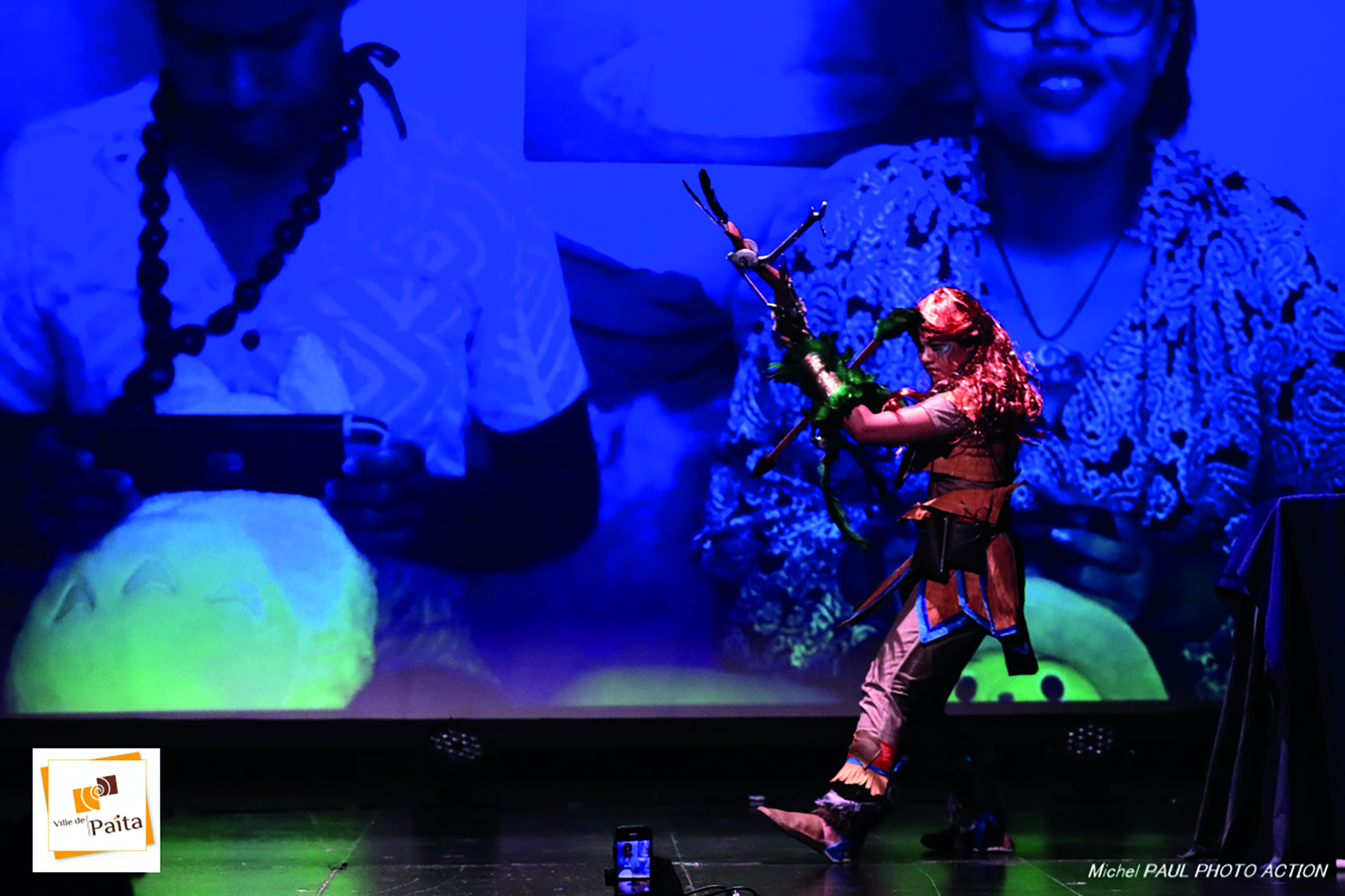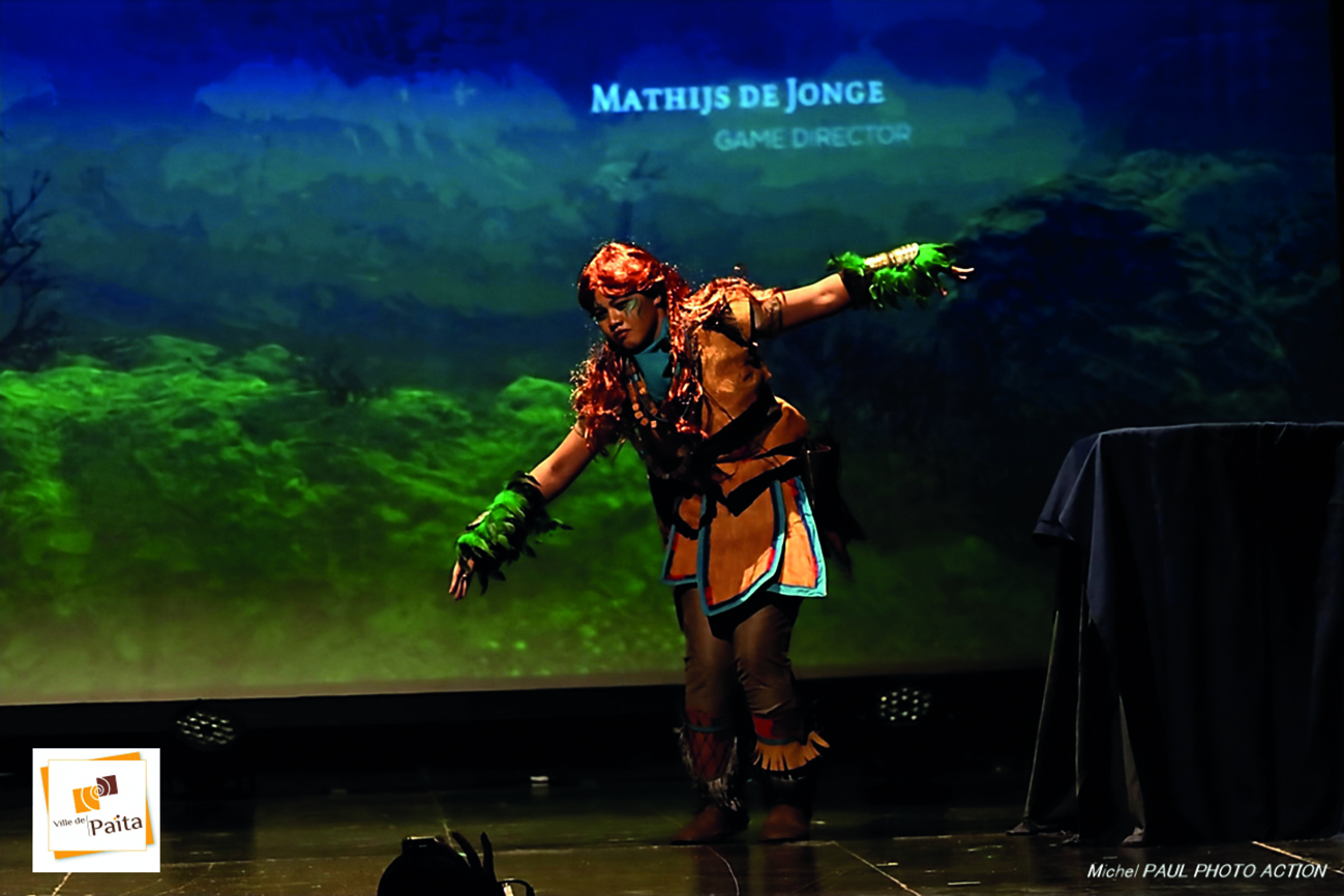 La prestation s’est déroulée en deux temps. D’abord, Aloy est montée sur scène alors que sur l’écran apparaissait Tokki en train de jouer et de maîtriser son avatar. Puis a suivi une partie plus culturelle. L’héroïne a chassé un dinosaure et dansé un hakamanu pour évoquer les Marquises et un extrait du haka kamate (ka ora) emprunté aux voisins maoris. Tokki a eu à cœur de rendre hommage à la Terre des hommes où elle a vécu petite. “J’étais un peu rouillée. Je n’avais pas dansé depuis longtemps. J’espère que les Marquisiens ne m’en voudront pas”, glisse-t-elle au passage.