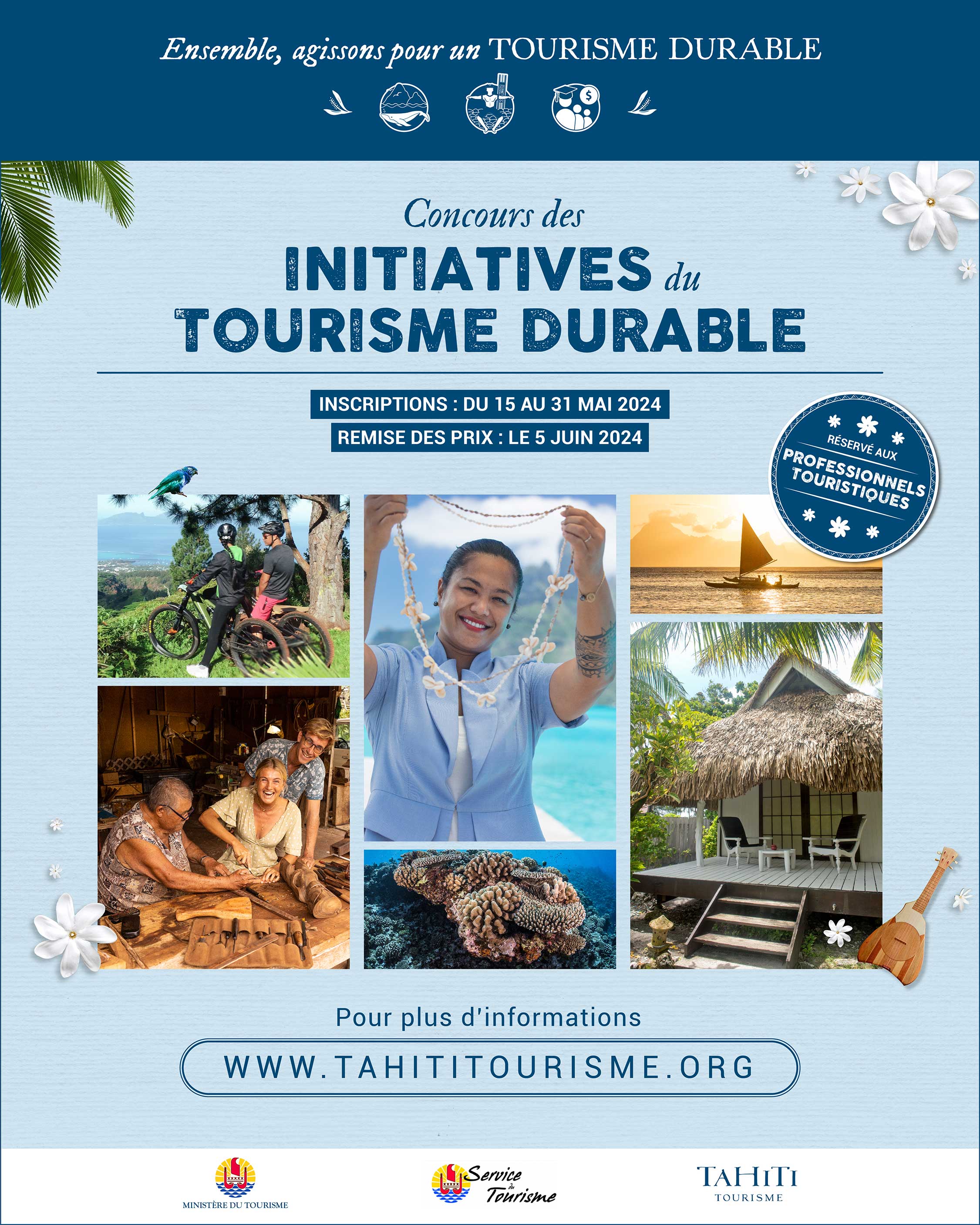 Tahiti, le 15 mai 2024 – À l'approche de la journée mondiale pour un tourisme responsable et respectueux qui se tiendra le 2 juin prochain, Tahiti Tourisme organise son "Concours des initiatives du tourisme durable". Un événement réservé aux professionnels du secteur afin de valoriser et impulser ces initiatives dans le cadre du plan Fari’ira’a Manihini 2027.