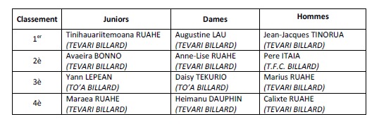 A l’issue du tournoi, Jean-Jacques TINORUA devient le champion de Tahiti de la 9 américaine en catégorie sénior homme en battant Pere ITAIA (TFC Billard) sur un score de 7 jeux à 0.
