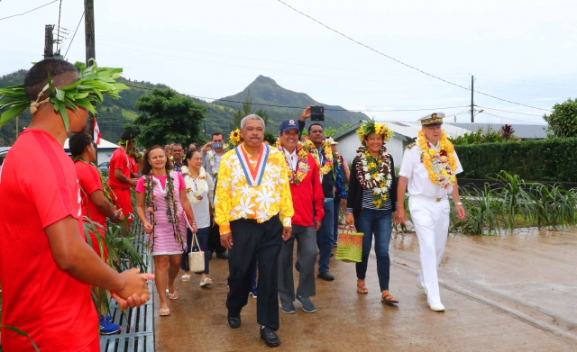 Le président du Pays Edouard Fritch, accompagné des ministres Tearii Alpha, Jacques Raynal, Christelle Lehartel et René Temeharo, de la sénatrice Lana Tetuanui, de la députée Nicole Sanquer, du président du syndicat pour la promotion des communes, Cyril Tetuanui, et de représentants de l’Assemblée a effectué une tournée aux Australes entre mercredi et dimanche.