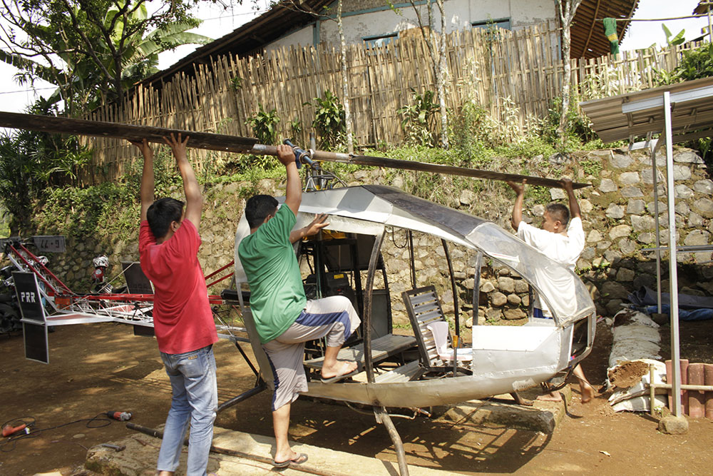 Jujun Junaedi passe des journées entières dans sa cour, bricolant et fignolant son hélicoptère fait maison, à l'aide de vidéos visionnées sur internet, en espérant un jour pouvoir survoler sa ville de Sukabumi et ses encombrements.