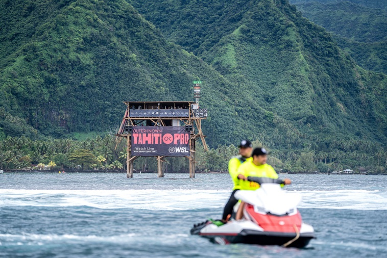 Ce Tahiti Pro sera la première occasion pour le Cojo d'éprouver son dispositif. Un deuxième test sera organisé en mai 2024 à un peu moins de deux mois du lancement des premières séries olympiques à Teahupo'o. (photo : Jérôme Brouillet / AFP)