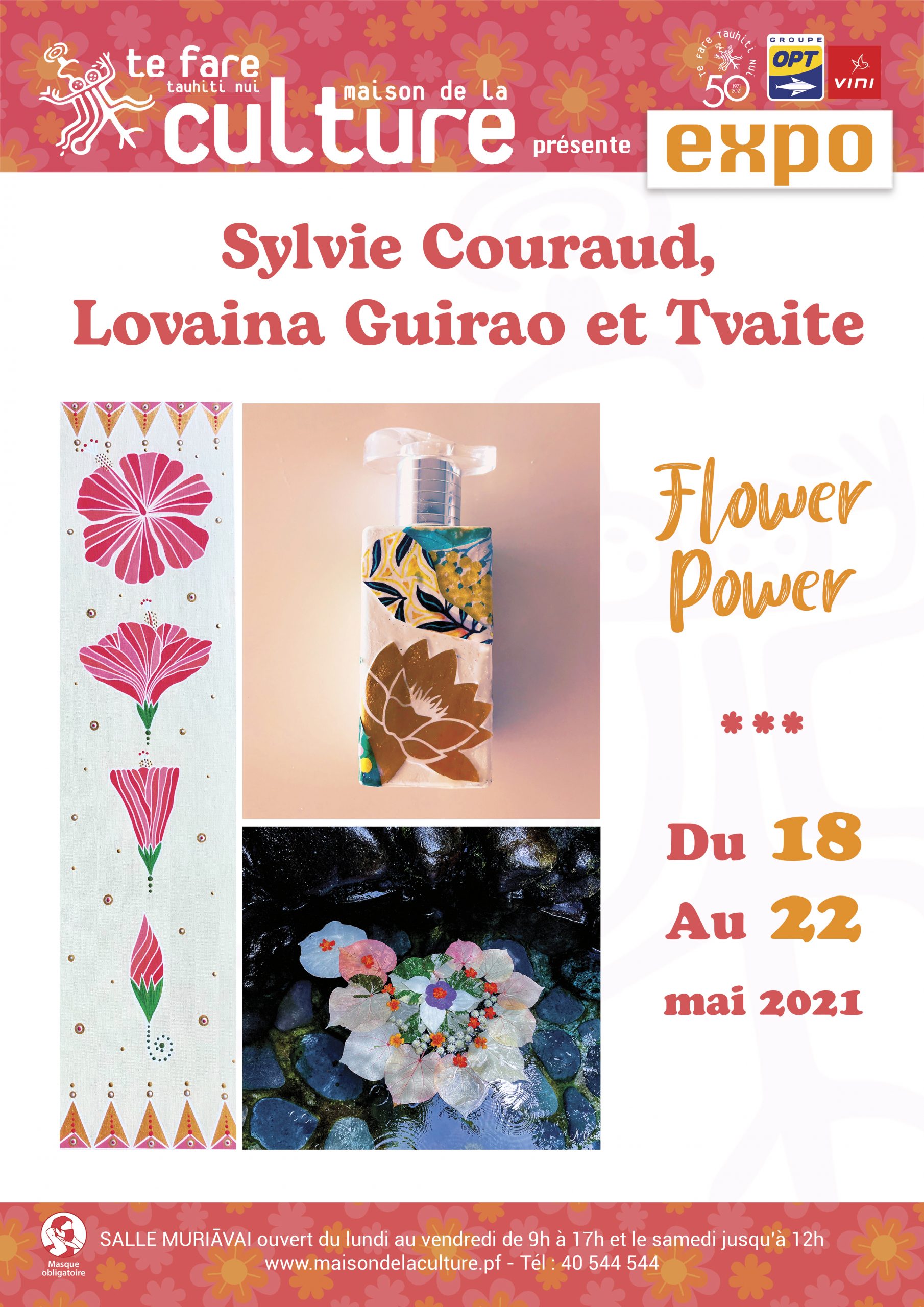 TAHITI, le 16 mai 2021 - Lovaina Guirao, nez, Sylvie Couraud compositrice de folichromies et Tvaite, peintre, se retrouvent cette semaine salle Muriāvai, unies par un thème commun : les fleurs. Elles ont à offrir une bulle de lumière, douce et légère, sans autre intention que l’esthétisme. Un bol d’air devenu nécessaire.
