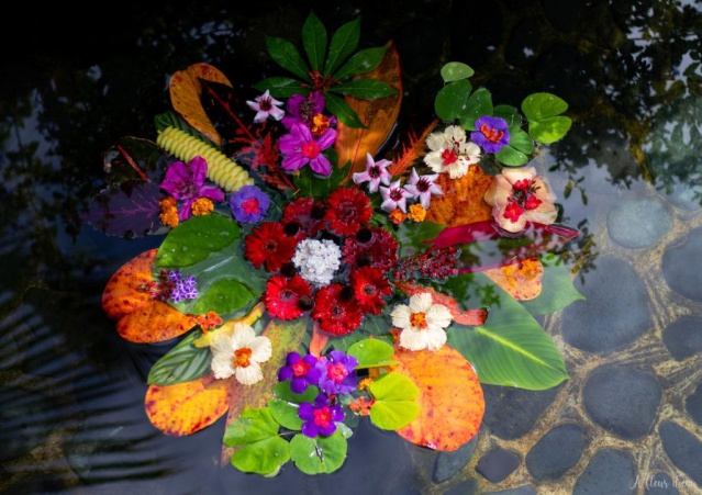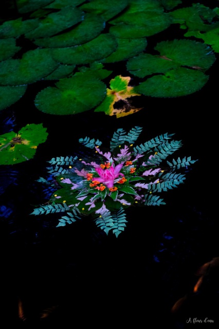 Sylvie Couraud quant à elle compose régulièrement des Folichromies dans une vasque de pierres où coule l’eau de source. Les folichromies étant le nom donné à ses créations végétales faites de feuilles et de fleurs entrelacées et cousues. "Elles s’inscrivent dans ce qu’on appelle l’art éphémère, puisqu’elles ne durent que le temps de leur vie sur l’eau…environ deux ou trois jours."